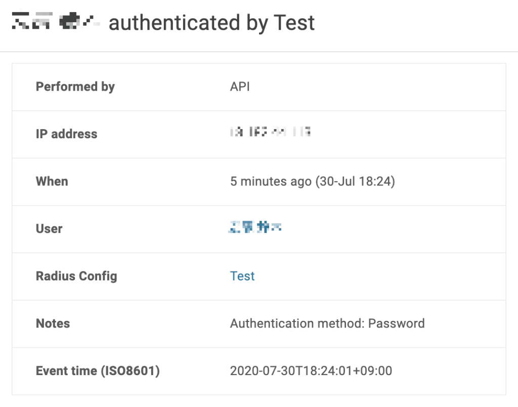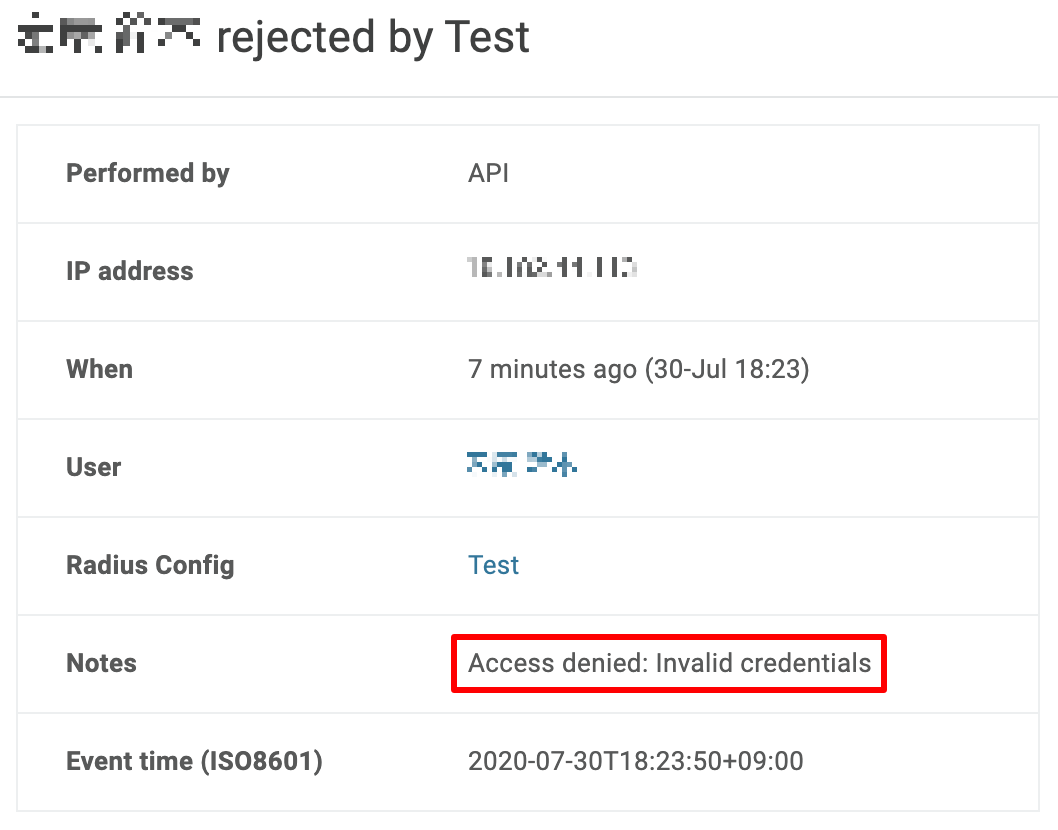 下記のようにRADIUS(Test)に対する認証成功(authenticated) と認証失敗(rejected)が確認できます。