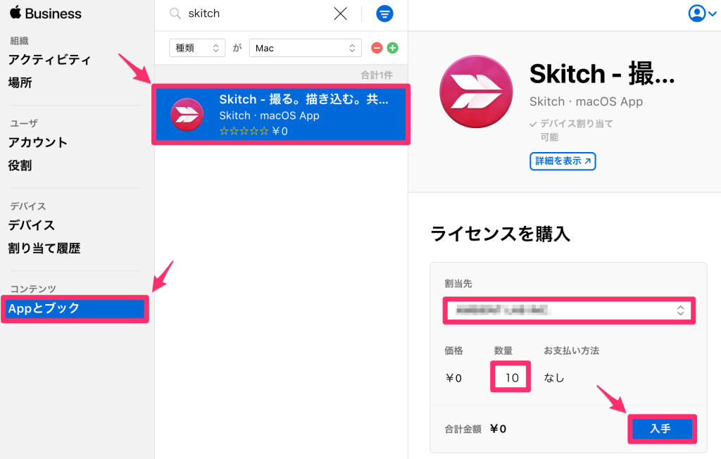 「Appとブック」から必要なアプリ(Skitch)を検索して、必要な数量のライセンス(無料だけど)を購入します。